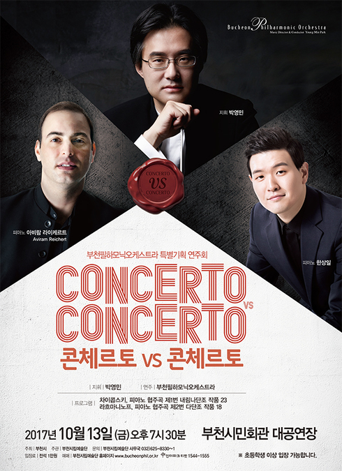 는 한 연주회에 하나의 협주곡 밖에 들을 수 없는 일반적인 연주회의 틀에서 벗어나 오직 협주곡만으로 프로그램을 구성한 2016년부터 진행해온 부천필하모닉오케스트라만의 특별하고 흥미로운 프로그램이다. 이번 <콘체르토 VS 콘체르토>는 오는 13일 오후 7시 30분, 부천시민회관 대공연장에서 상임지휘자 박영민의 지휘 아래, 현재 서울대학교 음악대학 교수 및 스타인웨이 아티스트로 활발한 활동을 펼치고 있는 피아니스트 아비람 라이케르트와 이화여대 초빙교수 및 국내외 콩쿠르에서 잇달아 수상하며 주목 받고 있는 피아니스트 한상일이 협연한다.