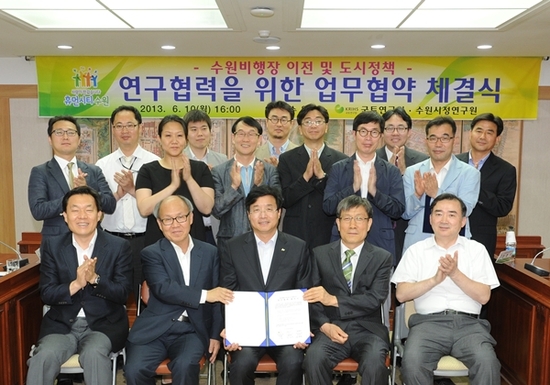 【경기인뉴스】채의선 기자 = 수원시는 10일 시청에서 국토연구원 및 수원시정연구원과 ‘수원비행장 미래비전 및 도시정책 연구협력을 위한 협약식’을 맺었다. 이번 협약은 지난 4월에 있었던 ‘군공항 이전을 위한 특별법’ 제정에 따른 후속조치로써, 수원시는 국토연구원, 수원시정연구원과 연구협력을 통해 수원비행장 이전 등 도시정책 방향에 대한 공동연구를 진행할 예정이다. 협약식은 염태영 수원시장, 박재길 국토연구원장 직무대행, 손혁재 수원시정연구원장 등 관계자 20여 명이 참석한 가운데 공동연구에 상호 적극적으로 협력할 것을 약속했다.