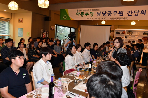 은수미 성남시장은 지난 10일 저녁 6시 30분에 분당구 율동 소재 음식점에서 아동수당 업무를 담당하는 시·구·동 직원 등 90여명과 함께 편안하고 자유로운 분위기에서 아동수당 업무 추진을 위해 애쓰는 직원들의 노고를 치하하고 직원들의 애로 및 건의사항을 듣는 간담회를 가졌다.