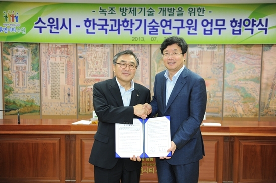 【경기인뉴스】박진영 기자 = 수원시와 한국과학기술연구원(KIST)은 녹조 방제기술의 성공적인 개발을 위해 전반에 걸친 연구개발과 산업 활성화를 위해 23일 업무협약(MOU)을 체결했다. 최근 지구 온난화의 여파로 인해 빈번하게 발생하는 재난상황의 하나로써, 상수원을 오염시키고 수자원 생태계를 파괴하는 등 국민의 불안감을 증가시키고 있는 녹조현상에 대한 원인 규명을 통해 궁극적으로 녹조를 예방하고 제거하는 기술을 개발, 국가적 재난에 근본적으로 대응하기 위해 수원시와 KIST가 함께 힘을 모으기로 했다. 이번 협약서에는 녹조방제기술개발과 지역사회 녹조문제 해결에 기여할 목적으로 △녹조방제기술 개발을 통한 수원시 녹조문제 해결 △녹조방제기술개발 관련 정보공유 △녹조문제해결을 위한 상호협력 증진을 위한 활동 등이 포함되어 있다. 이를 위해 수원시는 녹조방제기술개발을 위한 현장(서호하수처리장, 서호천, 서호저수지) 제공을 통해 실질적인 연구결과가 창출될 수 있도록 적극 지원할 예정이다. KIST가 녹조 사전예방과 제거기술개발 적용을 위해 핵심역량 연구자들을 참여시키고, 3년간 총 90억의 연구비를 전액 투입하는 대형연구프로젝트이다.
