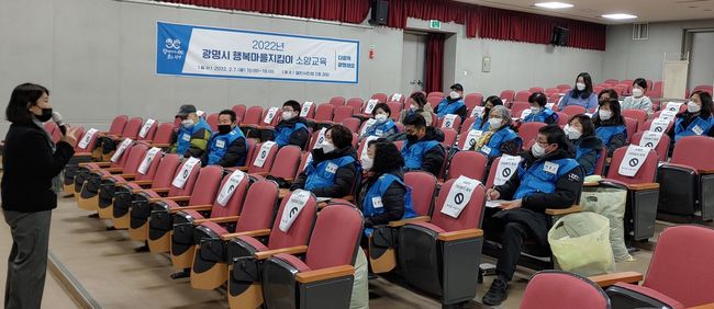 광명시는 행복마을관리소 확대 운영을 앞두고 올해 함께 할 행복마을지킴이를 대상으로 지난 7일 열린시민청(철산동 소재) 2층 강당에서 기간제 복무규정, 4대폭력 예방 등 기본 소양교육을 진행했다.