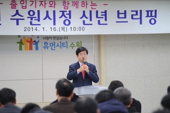 【경기인뉴스】박진영 기자 = 염태영 수원시장은 16일 올해 수원시정 방향을 경제복지, 사회복지, 주거복지, 교통복지, 환경복지, 교육복지, 문화복지 등 7개 분야 무지개 복지로 제시하고 “더 따뜻한 복지 수원을 만들겠다”고 다짐했다. 염 시장은 또 인구 100만 특례시로 진입하는 행정환경 변화와 역점 시책 추진을 위해 첨단교통과를 신설하는 등 조직개편을 통해 시민 행복과 이익 극대화를 위해 최선을 다하겠다고 말했다. 염 시장은 이날 시청 중회의실에서 열린 민선 5기 마지막 해 신년 기자간담회에서 ‘신뢰를 바탕으로 시민과의 약속을 완성한다’는 의미의 ‘信以成之(신이성지/논어)’로 시정에 임하는 각오를 대신하며 시정 추진 방향을 설명했다. 7개 분야 복지의 첫 번째 과제인 경제복지에 대해 “올해 일자리 목표를 2만7천개로 세웠다”며 수원형 창업성공시스템, 기업하기 좋은 환경 조성, 전통시장 활성화, 사회적기업 육성 등으로 주민들의 먹고 사는 문제를 풀어가겠다고 했다. 참여와 나눔으로 사회복지를 이루고 창조적 도시재생으로 주거복지, 격자형 철도네트워크로 교통복지, 고품격 공원녹지로 환경복지, 교육시설 개선으로 교육복지, 행궁 2단계 복원과 관광활성화로 문화복지를 각각 실현하겠다고 밝혔다. 염 시장은 이어 “수원 인구가 100만명을 넘은 지 10년이 지났지만 인구 4∼5만명에 불과한 행정 체제를 유지하고 있다”며 “올해 특례시 법제화를 이뤄 100만 도시 위상에 맞는 행정서비스 원년을 만들겠다”고 자신감을 보였다. 염 시장은 또 “공직자 청렴은 수원의 얼굴이자 경쟁력”이라며 “건설 현장 시민 모니터링단 구성 등 ‘청렴수원 플랜2.0’으로 현재의 청렴도 최우수 등급을 넘어 청렴도 1위 도시를 만들겠다”고 각오를 밝혔다. 지난 한 해의 평가를 묻는 질문에 염 시장은 “10년 동안 해결하지 못한 수원시 숙원 해결의 물꼬를 튼 해”라며 “공군비행장 이전 사업의 가시화, 농진청 등 공공기관 종전부지 활용계획 확정, 수인선 지하화 등은 미래 수원시 면모를 크게 바꾼 행정 성과로 기록될 것”이라고 답했다. 앞서 염 시장은 브리핑에서 시정 성과로 ▲프로야구 10구단 유치 ▲생태교통 페스티벌 성공 개최 ▲수원 분당선 전구간 개통 ▲재정 건전성 강화 ▲청렴도 1등급 평가 등 5가지를 꼽았다.