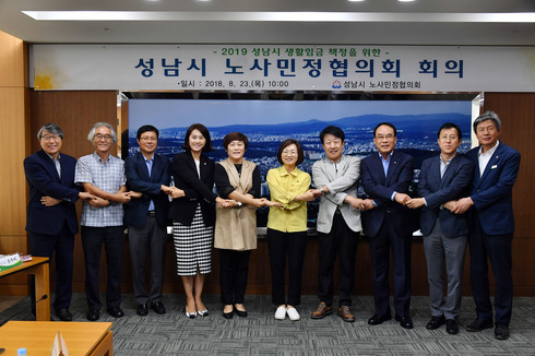 성남시 노사민정협의회가 내년도 생활임금 시급을 1만원으로 의결한 뒤 기념사진을 찍고 있다. |