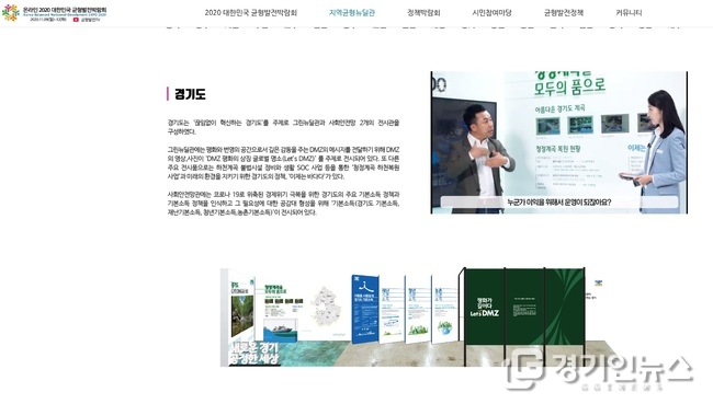 [경기인뉴스=홍충선 기자] 디엠지(DMZ), 기본소득, 청정 계곡·바다 복원 등 민선7기 경기도 주요 정책의 성과와 미래를 알릴 ‘2020년 대한민국 균형발전박람회-경기도관’이 9일 온라인을 통해 문을 열었다.