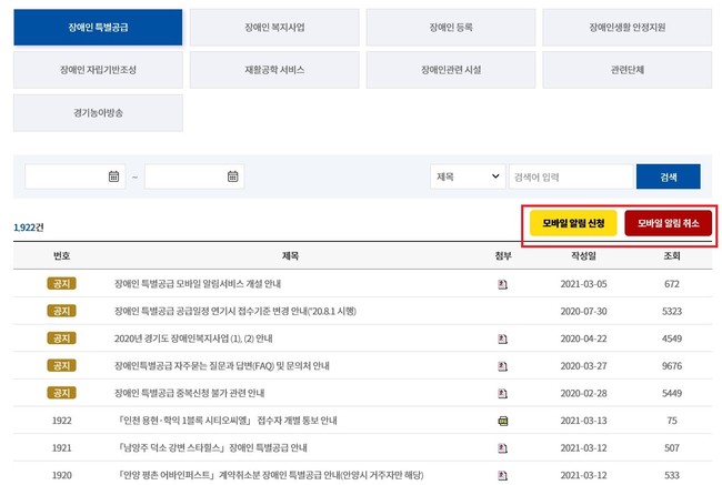 신청을 원하는 장애인이나 그 가족은 경기도 홈페이지→분야별정보→경기도민복지→장애인→장애인 특별공급 항목으로 들어가 ‘모바일 알림 신청’ 메뉴를 클릭한 후 신청하면 된다. 인터넷 사용이 어려운 장애인은 거주지 관할 읍·면·동 주민센터에 방문 또는 전화로 본인인증 절차를 거친 후 신청할 수 있다.