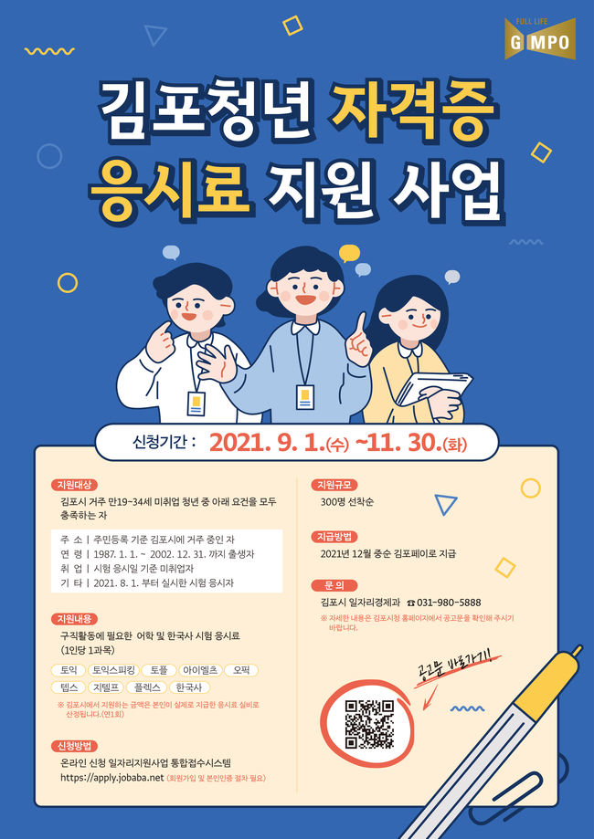 김포시가 전국 최초로 청년 취업준비생들의 자격증 응시료를 전면 지원한다.