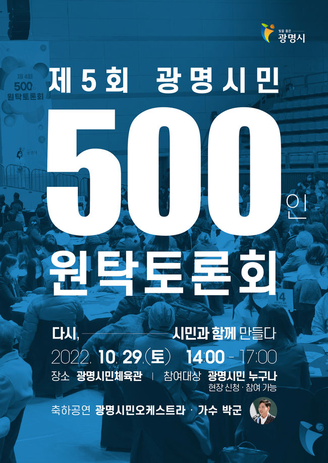 광명시는 오는 29일 토요일 오후 2시부터 5시까지 광명시민체육관에서 2022년 제5회 ‘광명시민 500인 원탁토론회’를 개최한다.