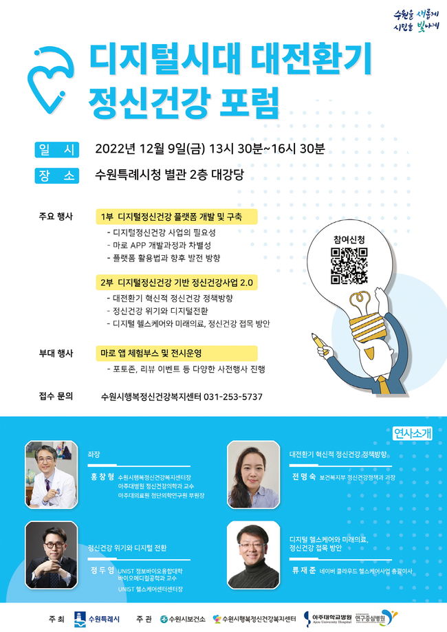 수원시가 12월 9일 오후 1시 30분 시청 대강당에서 ‘디지털시대 대전환기 정신건강 포럼’을 개최한다고 밝혔다.