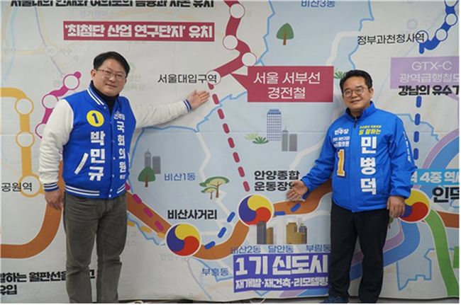 더불어민주당 민병덕 국회의원(경기 안양시 동안구 갑)은 25일 국회에서 같은 당 서울 관악구 갑 박민규 국회의원 후보와 ‘서울대-안양 직통선’(서울 서부선 경기 남부 연장) 실현을 위한 정책협약을 맺었음을 알리는 기자회견을 열었다.